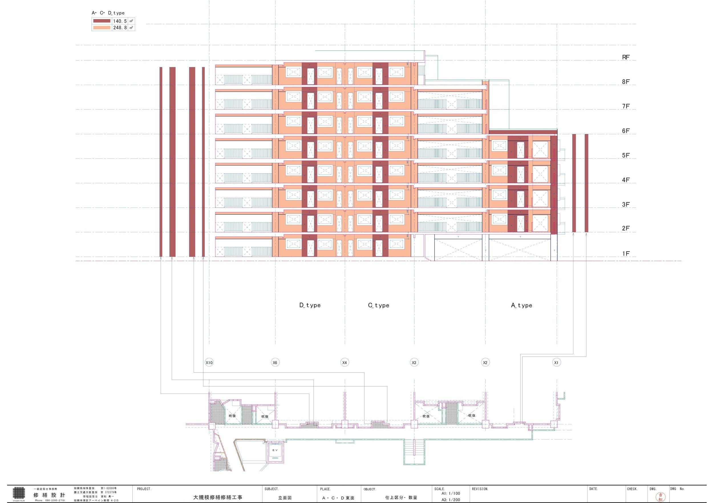 大規模修繕工事の見積は、「工事単価 × 仕上数量」によって算出されます。 工事単価については、他案件との比較が可能なため一定の参考になりますが、仕上数量は各マンションごとに固有であり、単純な比較はできません。 仕上数量の算出は、竣工図に記載された情報を「場所」「部位」「仕上げの種類」などに分類し、それぞれに対して「面積」「長さ」「個数」などの数量を拾い出すという、地道な作業によって行われます。 しかし、この作業にはどうしても担当者ごとのバラつきが生じやすく、結果は十人十色となるのが実情です。ある程度のバラつきは誤差の範囲として許容されますが、恣意的に数値を操作することは不誠実な行為であり、あってはなりません。 このような積算精度を高めることこそが、適正な工事見積の作成に直結するのです。当事務所は、必ず図面を作成し、積算精度の向上に努めています。